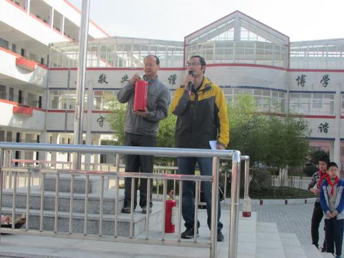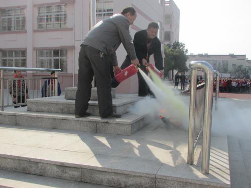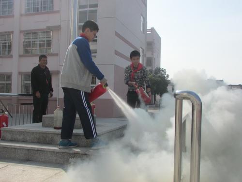 学校总务处的老师介绍了消防逃生的相关知识,并现场为师生们模拟了当火灾发生时如何使用灭火器救火的情景,并邀请2名学生进行了灭火实战演示,丰富了师生消防自救的知识。
