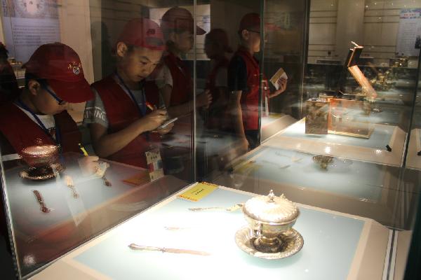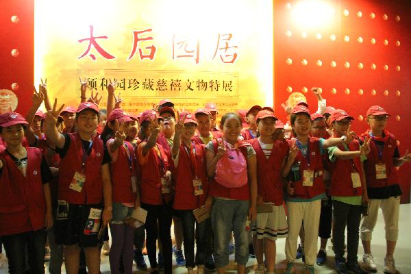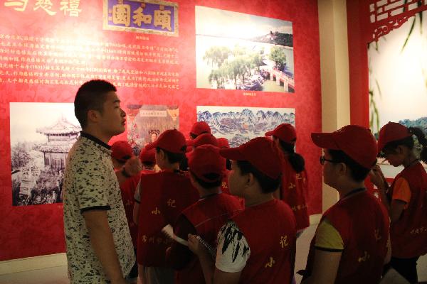 一进入慈禧文物特展,小记者们立刻被大量珍贵的文物吸引住了,一个个屏住了呼吸,瞪大了眼睛仔细地看,满目所见一件件华丽的珍品,仿佛置身于恢弘富丽的颐和园,感受到了那非凡的皇家气派。从1891年至1908年,作为颐和园的主人和晚清国家的最高统治者,慈禧太后在颐和园的湖光山色间度过了人生最后18年的大部分时光,或起居宴乐、或湖山悠游、或祝寿庆典、或治国理政。本次展览便分起居服用、文娱雅好、寿礼供奉、舶来奇珍四大版块,涵盖了衣食住行等多方面。小记者们一路前行,一路赞叹,将眼见所见的事物与讲解员或展板上生动的讲解结合起来,仿佛看到了慈禧奢华的起居生活,也对晚清文化及其时代历史文化背景有了更深刻的了解与感悟。