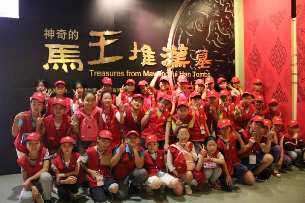 恋恋不舍地离开了慈禧珍品展,小记者们又穿越时空,来到“马王堆汉墓”寻“宝”。博物馆的灯光柔和而悠远,陈列柜中,从衣食住行到艺术创造,从天文历法到养生保健,从宴饮享乐到追求永恒,马王堆汉墓就像一部浩瀚深邃的百科全书,将一幅历时二百余年绚丽壮阔的西汉社会文明图景在我们眼前勾勒,引领小记者们回溯两千年的时光,领略巍巍大汉的雍容气度,感受神奇浪漫的汉代文明,怪不得被称为“20世纪震惊世界的重大发现”。小记者们直呼“眼睛看不过来啦”,双眼更是时刻不离那光亮如新的漆器、华丽轻柔的丝绸、翰墨飘香的帛书、巧夺天工的彩棺巨椁……并在本子上不断记录器物名称和相关知识,将它们一一收纳于心。