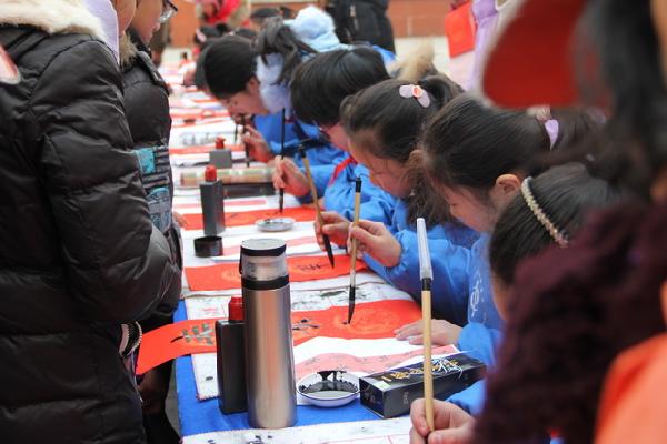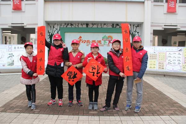 颁完奖,小小“和乐”书法家和书法大师、老师们强强联手,当场泼墨挥毫,通过春联表达自己的美好感受和对未来的美好期盼,同时为在场的家长、同学们送上一份份温馨的祝福,同学、老师的书法作品“一出炉”,就被一抢而空,供不应求啊!此时活跃的圩小“和乐”小记者们穿梭在人群中,不失时机地进行着采访,传递着万福。