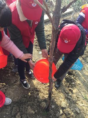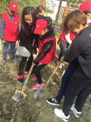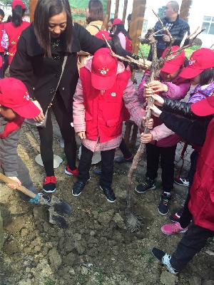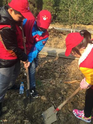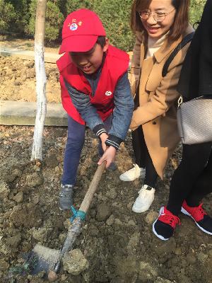 天趣园里,人头攒动,热闹非凡,在技术人员的协助下,家长和孩子们抡锄挖坑,手扶树苗,挥锹培土,提桶浇水,忙得不亦乐乎,干得热火朝天。小半天的功夫,棵棵树苗便悠然地“站立”在天趣园的沃土上,为校园增添了一道美丽的风景线!虽然队员们的脚上、裤腿上都沾满了泥巴,但望着自己亲手种植下的一棵棵小树,畅想着数年以后它们慢慢长大,枝繁叶茂,心中满是欢喜。