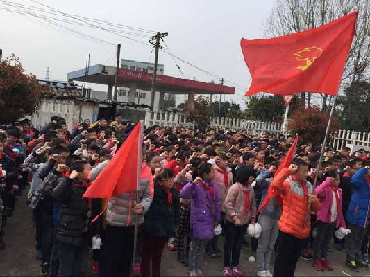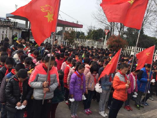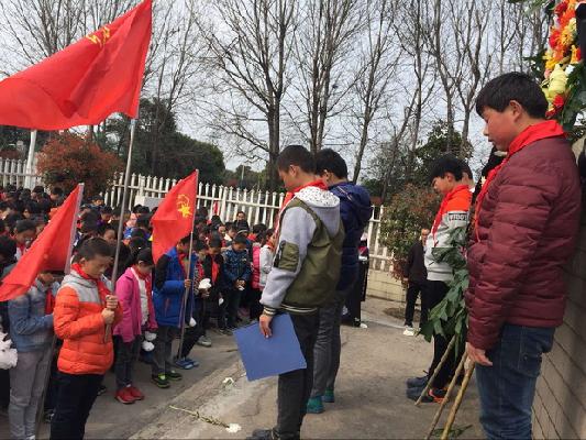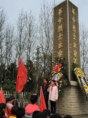 庄严肃穆的烈士陵园内,地面被雨水冲刷的干干净净,折射出星星点点的光芒。初春,雨后的阳光洒在这群朝气蓬勃的青少年的身上。队员们肃立在纪念碑前,举行简短而又隆重的悼念仪式:全体队员齐唱《中国少年先锋队队歌》,清脆嘹亮的歌声响彻烈士陵园的上空;五(1)班学生代表向烈士们敬献花圈,寄托哀思;队员们静立默哀,并向长眠地下的英雄们深深地三鞠躬;李萍老师饱含深情地讲述先烈们的故事,队员们对王友富等烈士短暂而光荣的一生有了更深刻的认识;少先队员代表张云云和於苗同学献词中表达了对先烈们的无限敬意并提出了倡议;辅导员代表张老师号召全体队员永远铭记先烈们的宏伟业绩和英勇事迹,继承革命先烈的遗志,更加努力地学习,长大成为祖国的栋梁之材;季亚丽老师带领全体队员呼号:“准备着,为共产主义而奋斗——时刻准备着!”响亮的誓言在苍松翠柏之间久久回荡。最后,同学们缓缓绕着烈士纪念碑一圈,有序地将朵朵白花小心翼翼地放在烈士纪念碑前或系在松柏上,向革命烈士鞠躬默哀寄托哀思,表达敬意与怀念。