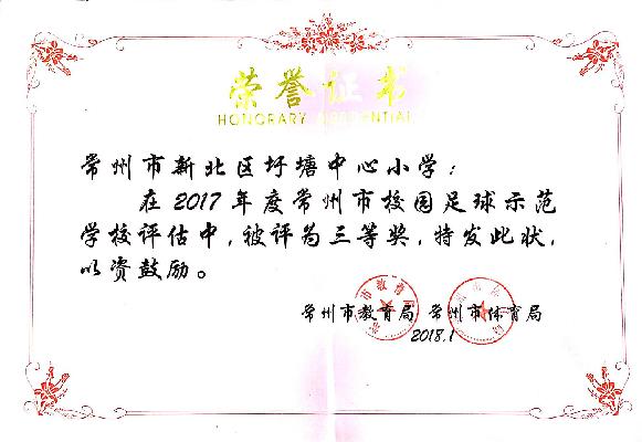 我校通过举行了校内足球联赛、开展足球冬令营、夏令营活动,激发学生的兴趣,提升学生参与足球活动的积极性。校级足球队积极参加市区组织的各类比赛,取得了优异的成绩。2017年5月,常州市小学生足球春季联赛女子甲组第六名;2017年7月新北区中小学生足球比赛中,女子乙组获第一名,女子甲组获第二名;2017年8月常州市小学生足球锦标赛女子乙组第六名。