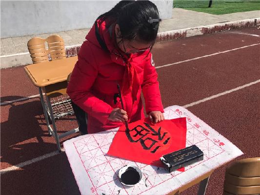新春到,祝福可少不了。瞧!书法社团的学员们端坐在舞台中央挥毫泼墨呢!他们在崭新的红纸上,大笔一挥,书写如行云流水,一个个大大的“福”字、一幅幅春联一气呵成。简短隆重的升旗仪式后,在欢乐喜庆的音乐声中,小小书法家们手拿春联和“福”字一一亮相,他们大声地向全校师生送出了美好的祝福,“迎新年平安幸福”“庆佳节万事如意”,台下的同学们也早已按捺不住,齐声喊出“平安如意”……并将福纸赠送给各年级师生,接到福纸的同学兴高采烈,孩子们开心地凑到一起,讨论并研摩这幅寓意新学期、新气象的“宝贝”。红红的春联,暖暖的阳光以及师生们灿烂的笑颜,为这个冬日增添了一抹最亮丽、最温馨的色彩。