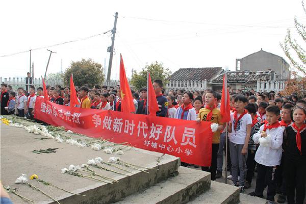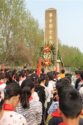 苍松翠柏环绕的烈士陵园显得格外庄严肃穆,队员们肃立在纪念碑前,举行简短而又隆重的悼念仪式:全体队员齐唱《中国少年先锋队队歌》,清脆嘹亮的歌声响彻烈士陵园的上空;优秀少先队员代表向烈士们敬献花圈,寄托哀思;队员们静立默哀,并向长眠地下的英雄们深深地三鞠躬;陈亚老师饱含深情地讲述王友富的故事,队员们对王友富等烈士短暂而光荣的一生有了更深刻的认识;少先队员代表张梓涵献词中表达了对先烈们的无限敬意并提出了倡议;辅导员代表徐玉老师号召全体队员永远铭记先烈们的宏伟业绩和英勇事迹,继承革命先烈的遗志,更加努力地学习,长大成为祖国的栋梁之材;最后,队员们缓缓绕着烈士纪念碑一圈,有序地将朵朵白花小心翼翼地放在烈士纪念碑前或系在松柏上,寄托着队员们对英烈深深的哀悼。