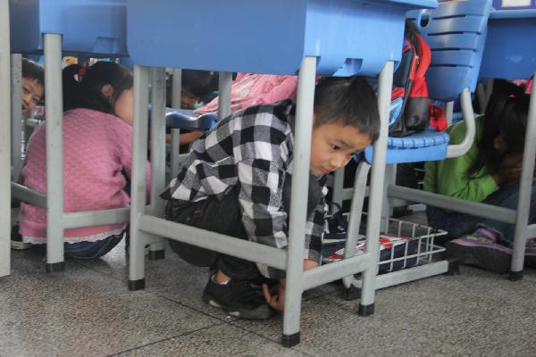 5月11日上午10点左右,防震逃生演练开始。急促刺耳的警报声响起,整个场面扣人心弦,同学们在老师的指导下,迅速抱头、闭眼,躲在各自的课桌下或课桌旁,尽量蜷曲身体,以避开地震开始时的强烈震动。当震感减落,铃声再次响起时,只见同学们双手抱头迅速进行安全撤离置,按预定方案进行疏散。整个过程用时2分13秒,井然有序,达到了预期效果。