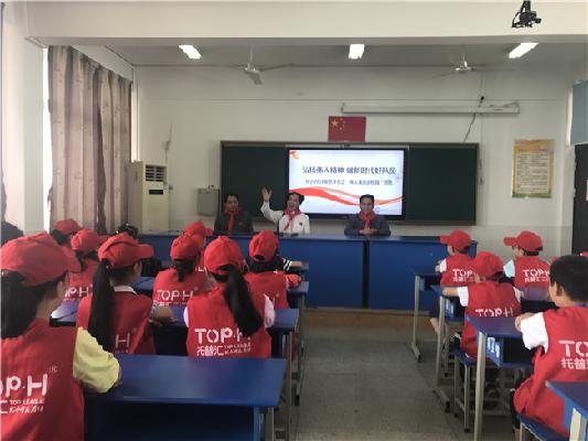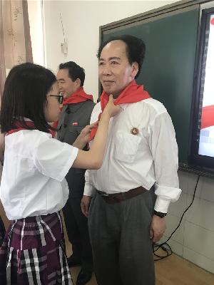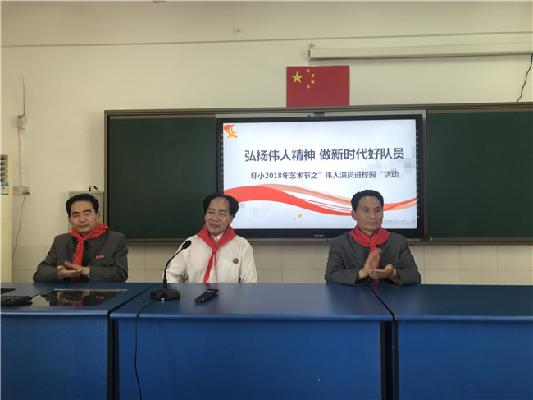活动伊始,少先队员代表为“伟人”演员们系上鲜艳的红领巾,敬少先队队礼。紧接着,毛主席的特型演员——曾德胜以毛主席特有的口吻向大家问候,队员们无不身临其境惊讶赞叹,以为敬爱的毛主席就在眼前。他为队员们讲起了毛主席的名言警句,鼓励大家好好学习,天天向上。周总理的特型演员——郭新国为大家讲起了周总理“为中华之崛起而读书”的典故,总理的少年壮志感染着现场的每一位队员。小平爷爷的故事你知道多少?特型演员朱传喜叔叔分享了邓主席的外交故事,队员们听得投入,现场不时爆发出阵阵热烈的掌声。