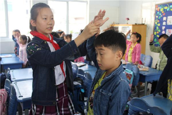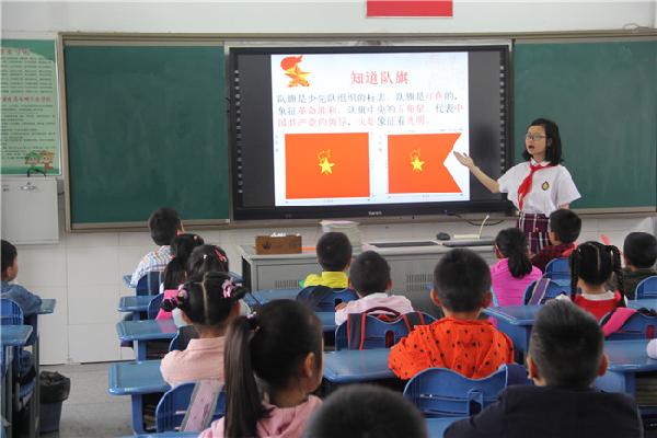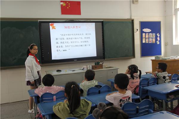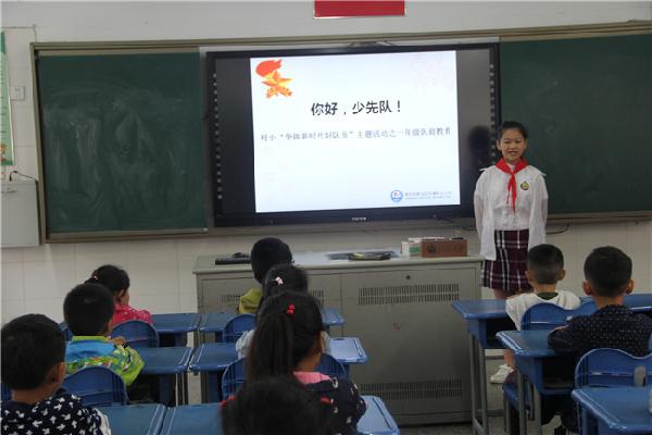 别开生面的队前教育课如期开始了。“我们一起讲队史”、“请跟我学敬队礼”、“我们的队歌”、宣誓、呼号、学习佩戴红领巾、队前做一件好事……小辅导员分批、分组地走进一年级的队会课堂,用动作演示、课件出示等多种方法普及队的知识。课堂上,小辅导员们有模有样地讲述习爷爷对少先队员的关心和嘱托;介绍少先队的组织生活和活动;讲述少先队的历史;讲解少先队的相关知识:教弟弟妹妹认识队旗理解星星火炬的含义,用儿歌的形式教弟弟妹妹佩戴红领巾,教唱队歌《我们是共产主义接班人》。一年级的小同学听得津津有味,看得专心致志。