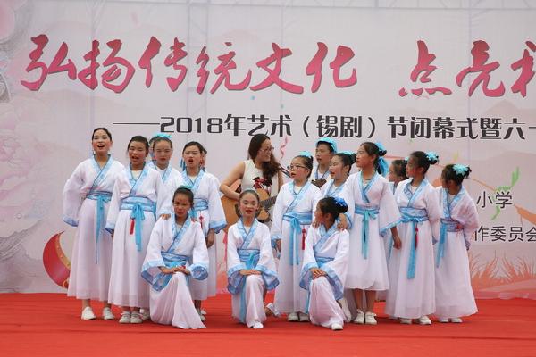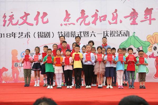 “我家住在长江边……”圩小锡剧版校歌《走向明天》拉开了六一庆祝活动的序幕,台上台下,孩子们唱得有声有色,稚嫩的童音犹有几分韵味。“朝霞映在阳澄湖上……”伴随着音乐声起,首先上场的是红色剧目《沙家浜·军民鱼水情》选段,小演员们倾情演绎,谱写了一曲英勇顽强,不屈不挠的军民鱼水情的赞歌。随后,女孩子的《拔兰花》开始了,曲声婉转,有腔有调,犹如一颗颗跳跃的种子,深深地播种进了孩子们的心田。紧接着,国家一级演员、校锡剧项目外聘辅导老师冯玉英登台演绎了锡剧《哑女告状》选段,委婉的唱腔和高超的艺术表现力深深地感染着现场的每一个人。最后,震撼人心的《梨园芳华》登场了!有轻摇折扇、盈盈走上台者,有手舞长刀上下翻飞者,有手挺花枪伸缩自如者,也有头顶长羽凤冠,阔步盎然英姿飒爽者,那一板一眼、干净利索的动作招式,每一个动作都牢牢地吸引住了同学们的视线,引来掌声迭起,连番叫好!