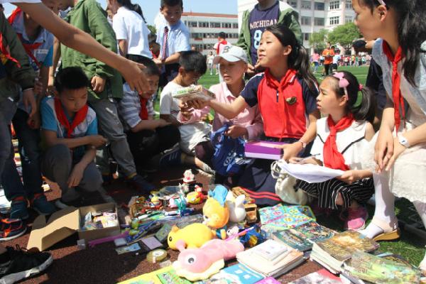 三——五年级同学们用心布置小操场上的“摊位”,宣传海报布置得五彩缤纷、别出心裁,主题气氛非常浓烈。跳蚤市场上的商品五花八门:有闲置的文化用品、图书;有各式新奇的玩具、小物品;还有学生自制的手工作品等。