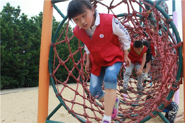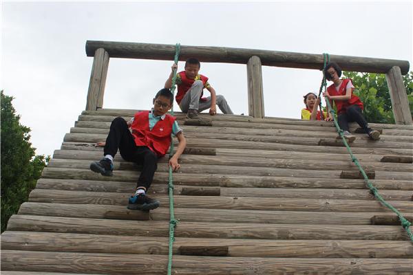 还没踏进“东方绿舟”大门,队员们就已经被壮观的瀑布和气魄宏伟的“东方绿舟”四个刚劲有力的大字吸引了。走进“东方绿舟”,满眼绿色让孩子们呼吸到大自然的气息。在导游的带领下,很快,“勇敢者道路”游艺区已经出现大家的眼前。“攀岩”、“梅花桩”、“滑梯”等一个个项目不仅锻炼同学们的跑、跳、投、攀、爬、跨、跃等的技能,还培养了大家的合作意识。