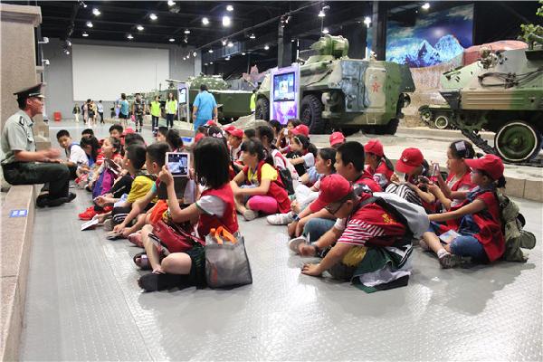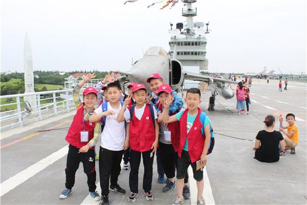 下午,队员们来到气势宏伟的 “航空母舰”参观。远远望去,巨大的“航母”就像一艘水中霸王,无数的武器散布在队员们周围,火箭、导弹、大炮令人目不暇接。走进“航母”巨大的“腹部”,是壮观的上海兵器博物馆。在教官的带领和讲解下,小记者们细细参观了起来,舰上一层为“装备陈列厅”,两旁放置坦克、装甲车和各种类型的大炮等器械的实物或模型。脚蹬铁梯来到二层,“国防教育厅”和“国家安全教育厅”,通过多媒体和大屏幕、立体声,《国防法》、《兵役法》和《国防教育法》等形象生动地走进我们的视觉。“航母”甲板更让孩子们感到了它的“阔气”:你看,地上有一些排列整齐似碗口大的“盖子”,一问原来是栓住飞机的“系索栓”,而甲板上摆放的5架飞机,有的呈起飞状态,有的呈降落状态,更是壮观……