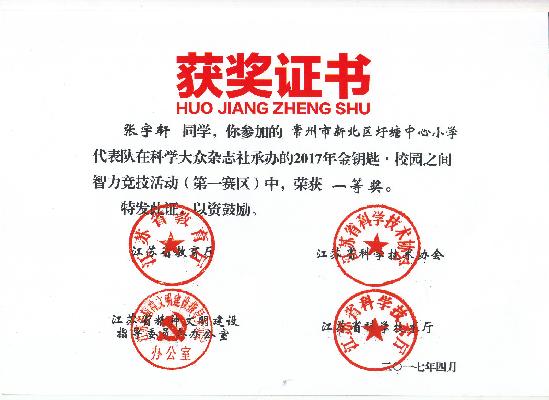 金钥匙.校园之间智力竞赛学生获奖证书