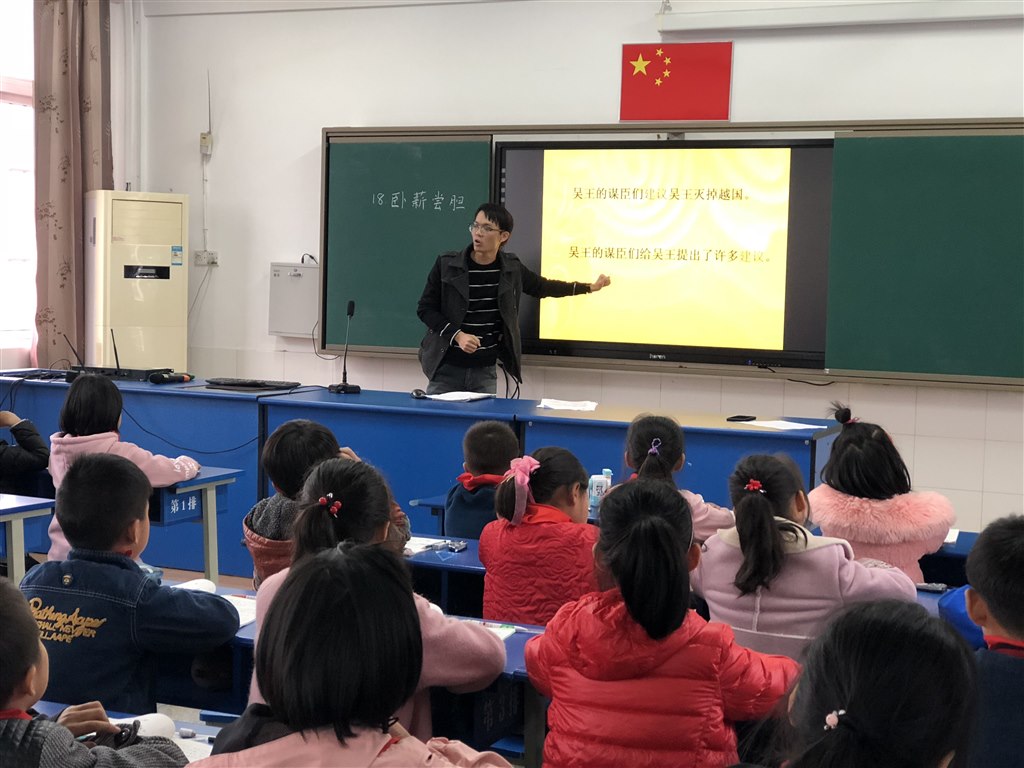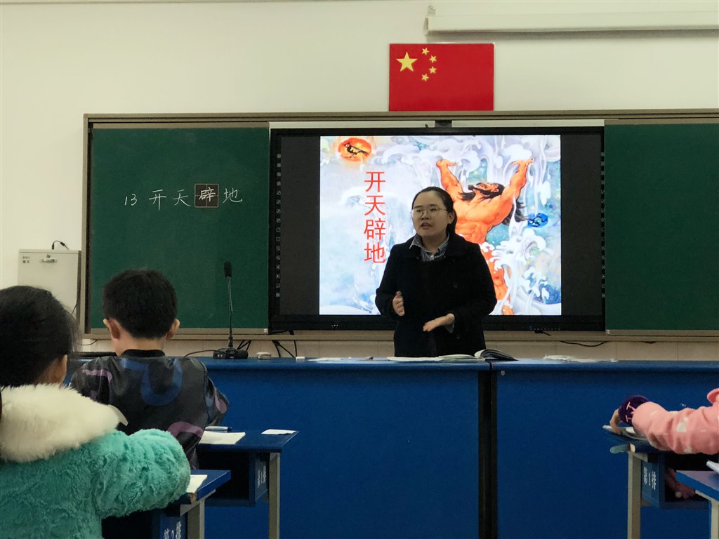 钱彬老师的《卧薪尝胆》第二课时注重环节,语言幽默风趣,学生们高度集中,在有序的课程推进中理解“卧薪尝胆”的精神内涵。陈雯老师的《开天辟地》第一课时扎实推进,学生们在朗朗书声中兴致高涨的讲述神话故事的神奇。