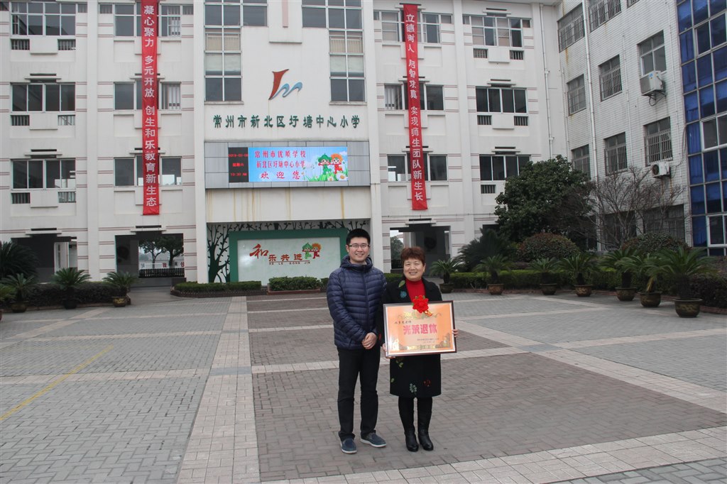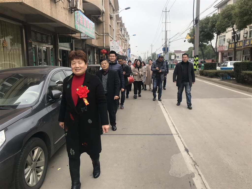 会后,一行人敲锣打鼓欢送顾多慧老师回家,一路上引来了左邻右舍的围观,顾老师胸前戴着红花,洋溢着幸福的笑容。