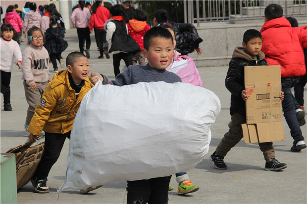 3月13日上午,伴随着欢快的音乐,孩子们带着积攒的废纸陆陆续续走进校园。6斤的废纸可是不轻呢,拖着,拽着,捧着,姿势各异但是挡不住大家的热情。不一会儿废纸就堆成了小山。活动末尾,辅导员老师将家校联系本递到每一位同学的手中。看着孩子们踊跃参与的样子,仿佛就是那一棵棵幸福成长的小树,沐浴着活动的阳光雨露茁壮成长。