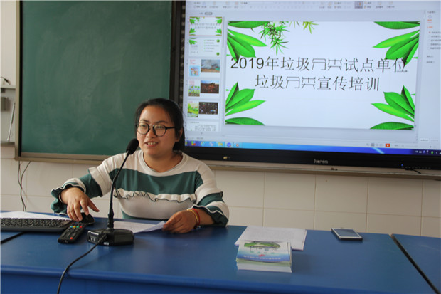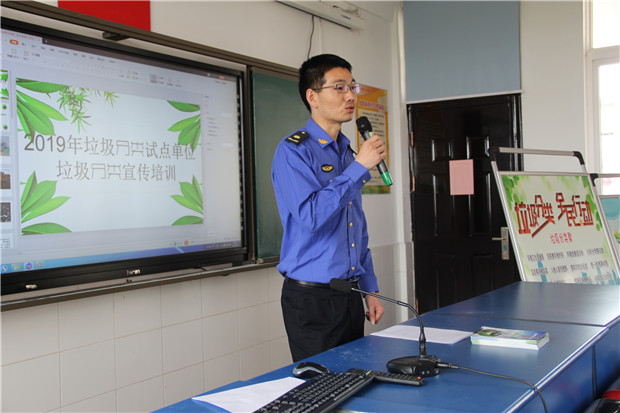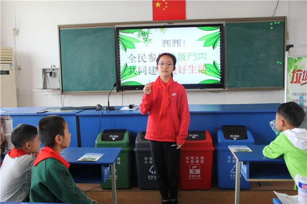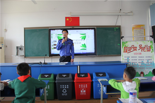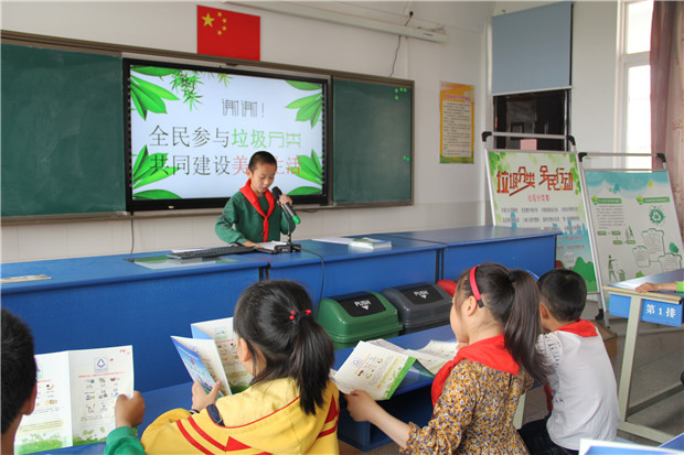 在多媒体教室,城管执法中心工作人员向学生们发放了《常州市新北区生活垃圾分类宣传手册》,随后由我校科学老师夏菁给学生们讲解了垃圾分类对保护环境的重要意义;接着城管工作人员通过播放生动有趣的垃圾分类宣传短视频并结合PPT,图文并茂向学生们讲解垃圾分类知识;理论知识讲解结束后,由学生代表宣读垃圾分类倡议书并带领全场学生们现场齐读垃圾分类歌;并检验了同学们垃圾分类知识掌握情况。最后,老师组织学生来到学校垃圾分类宣传栏点位,让学生们把从自己家里带来的各类垃圾分类投放,并给正确分类投放的学生发放了美丽的康乃馨和分类宣传小礼品。