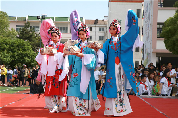 我们学校坐落在美丽的春江镇,濒临浩瀚长江,溢满江南神韵。锡剧节目《拔兰花》、《珍珠塔》选段《赠塔》等曲声婉转,有腔有调,犹如一颗颗跳跃的种子,播种进了孩子们的心田。这份沉甸甸的江南水乡珍宝,让在场的每一个人深深地陶醉。舞蹈《俏江南》让我们再一次感受俏丽明媚的江南水乡。最后,震撼人心的锡剧形把组合《梨园芳华》登场了!有轻摇折扇、盈盈走上台者,有手舞长刀上下翻飞者,有手挺花枪伸缩自如者,也有头顶长羽凤冠,阔步盎然英姿飒爽者,那一板一眼、干净利索的动作招式,每一个动作都牢牢地吸引住了同学们的视线,引来掌声迭起,连番叫好!