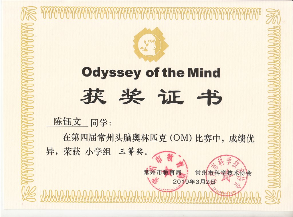 第四届常州市头脑奥林匹克(OM)比赛获奖证书