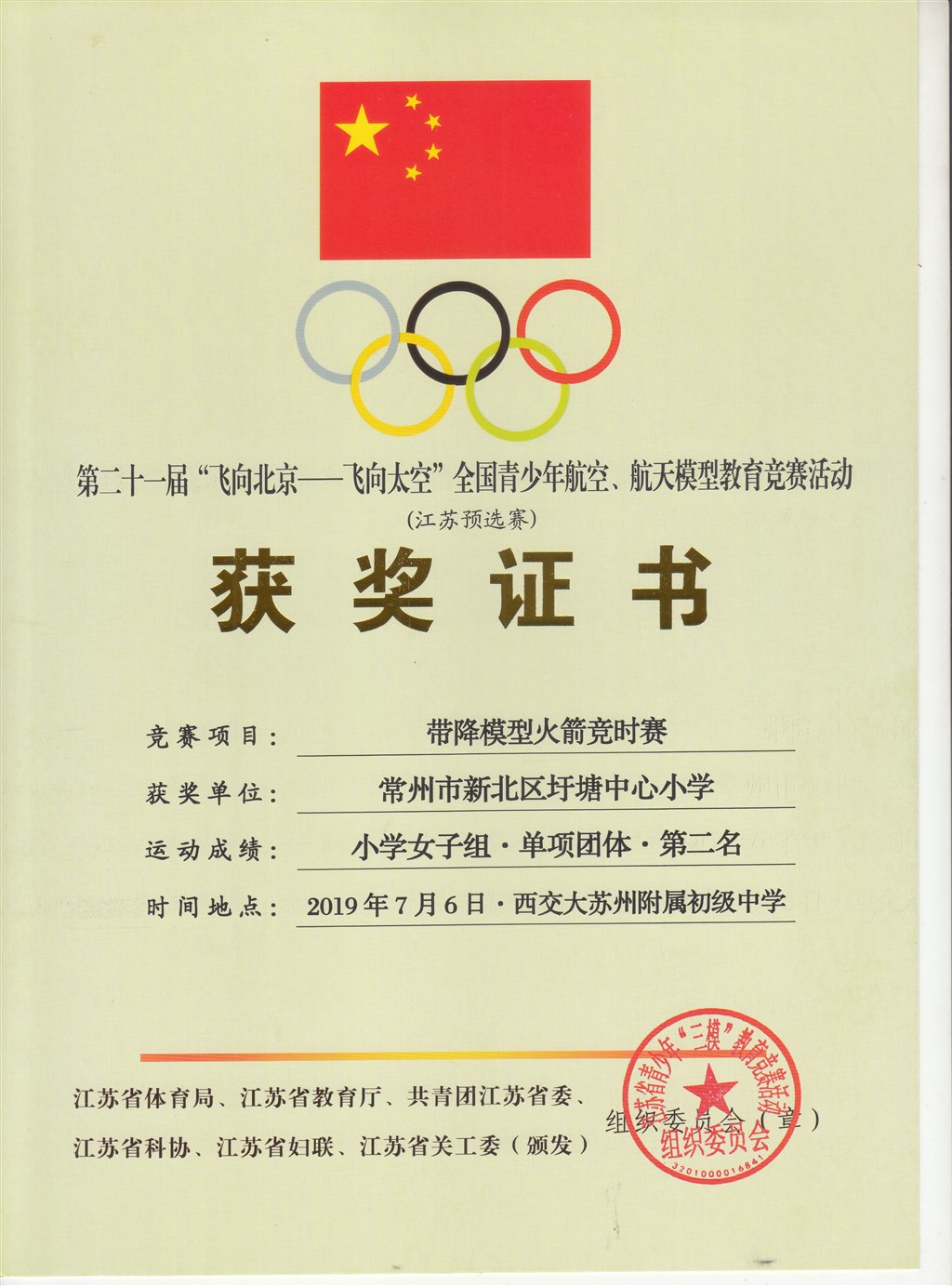 第二十一届“飞向北京-飞向太空”全国青少年航空、航天模型教育竞赛小学女子团体一等奖、男子团体二等奖、单项奖获奖证书