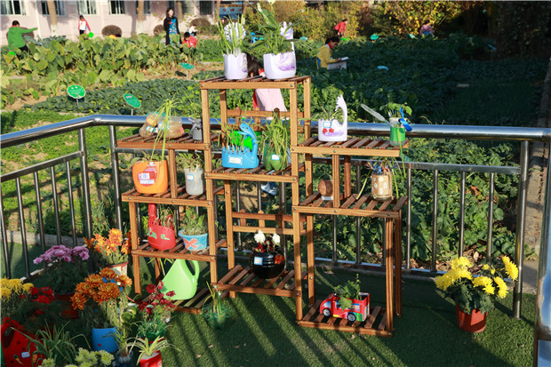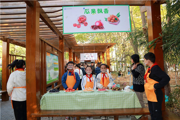 学生社团孕育生态文明新素养。校园里,活跃着一个个生态社团的身影。来宾们在“秋天的芦苇”活动小组旁不时驻足。前期,和乐娃们前往圩塘汽渡周边的芦苇荡江边采集了许多的芦苇,邀请了校外辅导员王奶奶来校。只见奶奶手飞快地翻动,一根根芦苇交错穿插,一双古朴的薄鞋就在她的手中渐渐成型了。围观的来宾们新奇万分,不停询问。瞧!“探秘长江鱼”的孩子们在细细描绘着鱼的纹样,写下一段段研究心得;“种子贴画”、“叶脉书签”社团的孩子们在老师的带领下,发挥了自己的创意,用巧手展现丰富的作品。最令来宾们驻足的,便是天趣园的“收获节”了。暮秋时节,蔬果的香气、收获的喜悦早已溢满校园。竹篮、蒸笼、托盘等富有农家气息的器具,轻声诉说丰收的故事;萝卜、青菜、芋头、石榴、柿子等,一一展现和乐娃们辛勤种植的汗水与美好。“农家小食”、“五谷丰登”、“甜甜鲜饮”、“瓜果飘香”四大主题美食区里,孩子们快乐地忙活着,美味的馄饨、诱人的南瓜丝饼、酥脆的春卷、软糯的蓬蒿团子、象征团圆的月亮饼、甜甜的芋头、香醇的芝麻糊……令来宾们食指大动,迫不及待地品尝起来。与丰富多彩的社团活动相互辉映的,还有生态木架展示的数百件充满奇思妙想的学生环保生态手工作品。