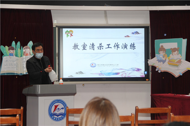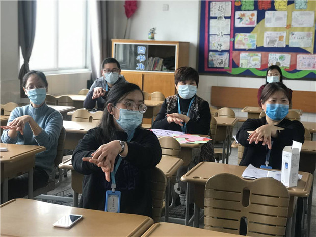 首先,曹校长从开学前准备工作、开学当日工作、开学后日常工作等方面进行了细致的讲解与指导。王赛男主任在培训会上详细说明了在返校复课以及学生发热、呕吐等突发事件应急处理中的具体流程、人员管理、岗位职责等要求。顾华杰主任一一阐明了废弃口罩处理办法、教室疏散路线图等。冯炜主任就教室消杀、用餐等方面的工作进行部署。徐玉主任作值周教师培训,进一步细化值周流程,压实值周责任,为上放学、课间保驾护航。全体教师以年级组单位,着重演练了班级发生学生体温异常或呕吐的情况时,老师们应该做出怎样的应急处置。同时还进行了七步洗手法的演练、上放学流程演练、消防安全演练等,老师们认真听、仔细做,将各项防控流程牢记于心。最后,王志良校长再次强调了防疫工作的重要性,希望圩小的全体教师能够进一步提高思想认识,做好细致工作,为学生和家长送去安全的保障和关爱。