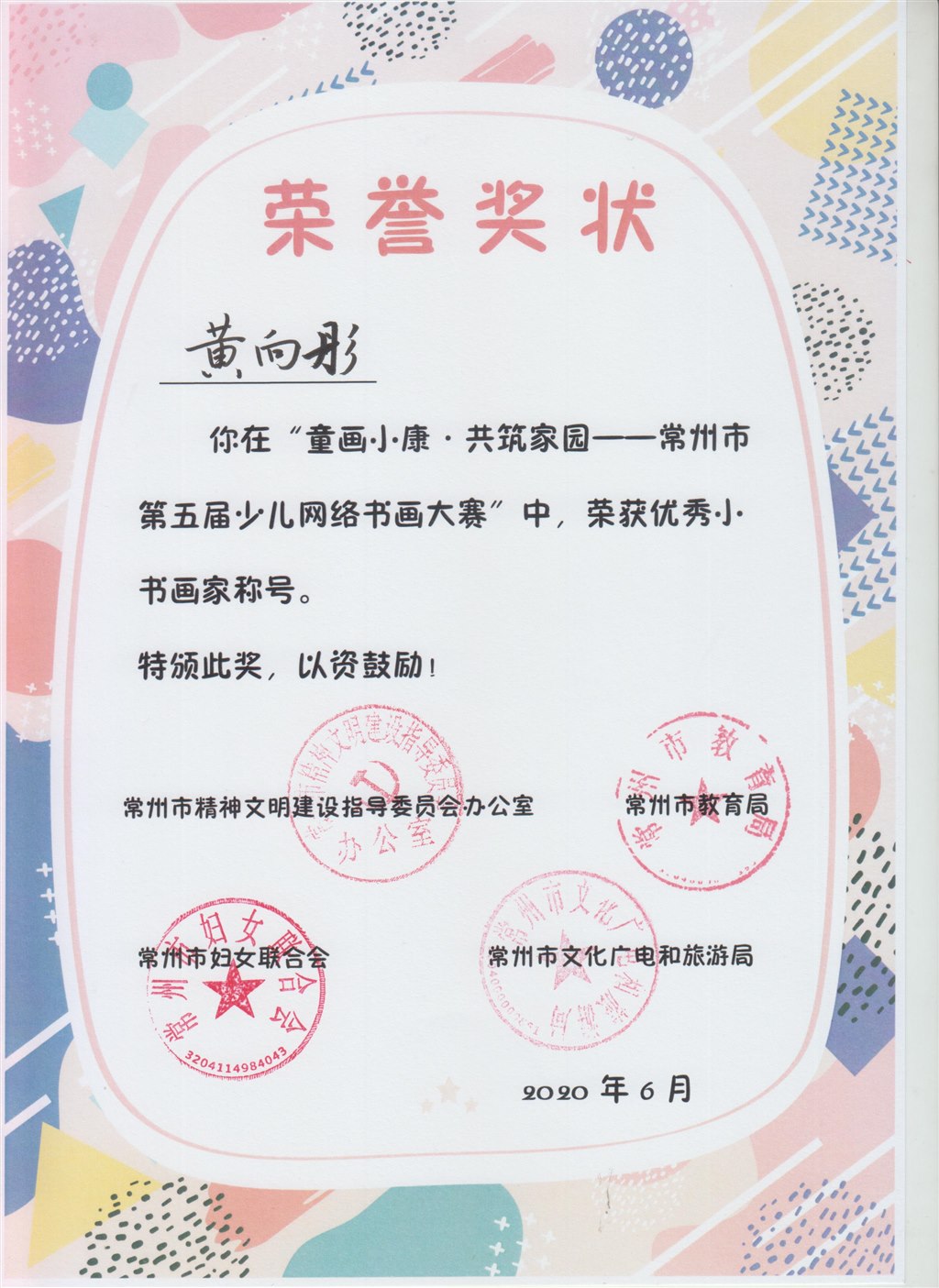 “童画小康.共筑家园--常州市第五届少儿网络书画大赛”获奖证书