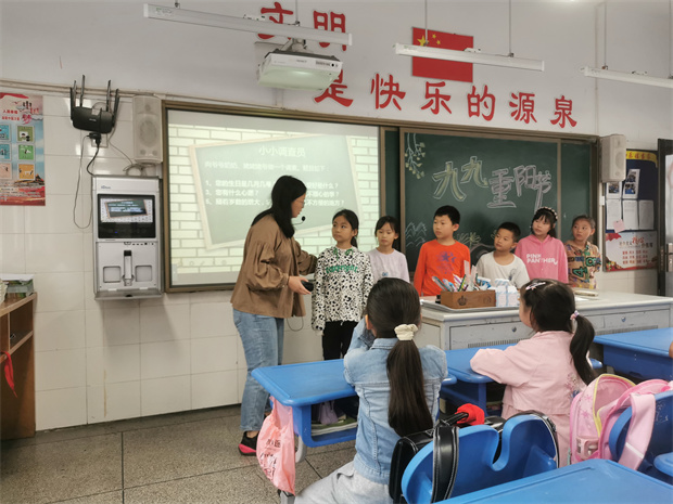 利用主题班会,每位班主任引导孩子们了解重阳节的来历,宣传重阳节有关的传统习俗。并通过发起倡议,让孩子同学们在家为爷爷奶奶开展“讲一个故事”、“唱一首歌”、“捶一次背”、“做一次家务”等体验活动,感谢长辈的养育之恩。