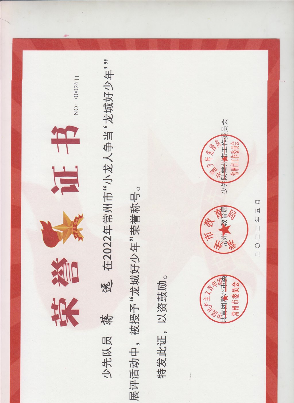 杨玲、胡益璠、张丽瑶等同学在2022年常州市“小龙人争当‘龙城好少年’”活动中,获“龙城好少年”荣誉称号