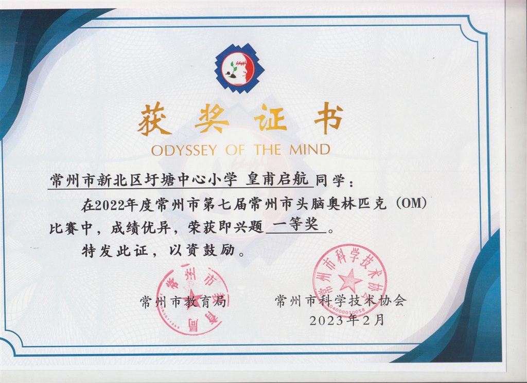 彭方芳、方紫涵等同学获2022年度常州市第七届头脑奥林匹克比赛一等奖;王晨辰老师获 优秀辅导员 称号