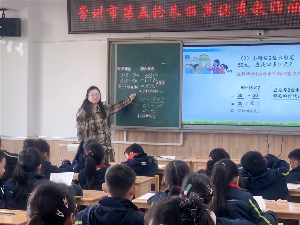 褚越倩老师执教三下《混合运算》。褚老师借助例题中的实际问题,从学生熟悉的购物场景入手,通过与分步算式的对比引入综合算式,结合实际问题的解题思路示范用递等式计算的过程;利用解题后的对比提示混合运算的含义。在练习时设置闯关环节,激发学生的学习动力,明确给先算部分划上横线,让学生进一步理解运算顺序。(插入图片3、4)